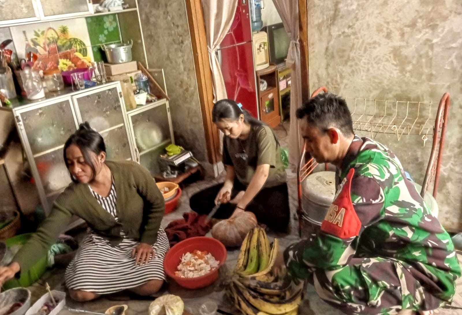 Warga yang sedang mempersiapkan masakan pun tampak gembira. Tambahan tenaga dari Serda Ujang, jelas sangat meringankan pekerjaan mereka.