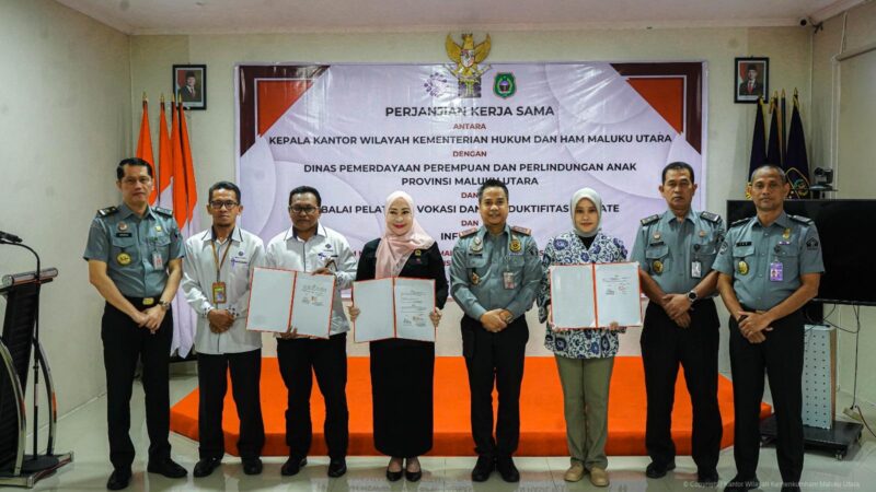 Ternate – Kakanwil Kemenkumham Malut Andi Taletting Langi baru saja melakukan penandatanganan dengan 2 stakeholder dan 1 influencer lokal Kota Ternate untuk mengoptimalkan pemasaran hasil karya yang diproduksi Warga Binaan saat menjalani hukuman di dalam Lapas/Rutan.