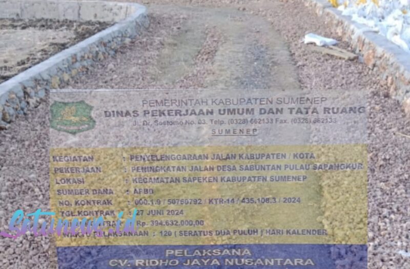Sumenep, Satunews.id – Proyek pengaspalan jalan Desa Sabuntan, senilai hampir Rp 400 juta yang bersumber dari APBD tahun 2024 di Pulau Sapangkur terindikasi syarat penyelewengan dan merugikan masyarakat setempat.
