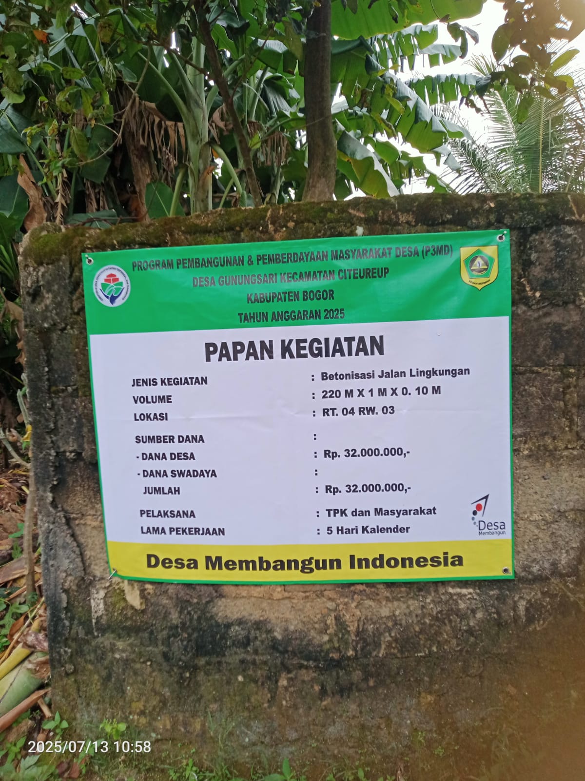 Bogor, Satunews.id – Pemerintahan Desa Gunungsari merealisasi program pembangunan betonisasi jalan, tepatnya di lingkungan RT 04 / RW 03, RT 04 / RW 01 Kecamatan Citeureup, Kabupaten Bogor. Minggu, 13/07/2025.