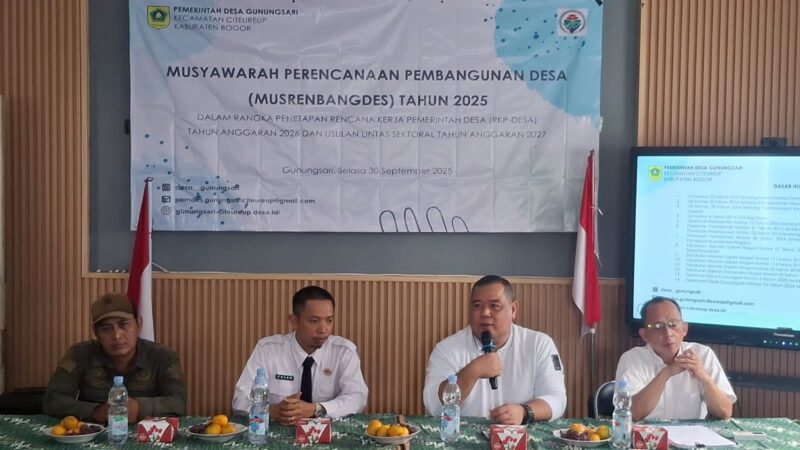 Bogor, satuNews.id – Selasa, 30 September 2025 | Pemerintah Desa (Pemdes) Gunungsari, Kecamatan Citeureup, Kabupaten Bogor, menggelar Musyawarah Perencanaan Pembangunan Desa (Musrenbangdes) Tahun 2025. Agenda ini menjadi forum penting untuk menetapkan Rencana Kerja Pemerintah Desa (RKPDes) Tahun Anggaran 2026 sekaligus merumuskan usulan program lintas sektoral untuk Tahun Anggaran 2027.