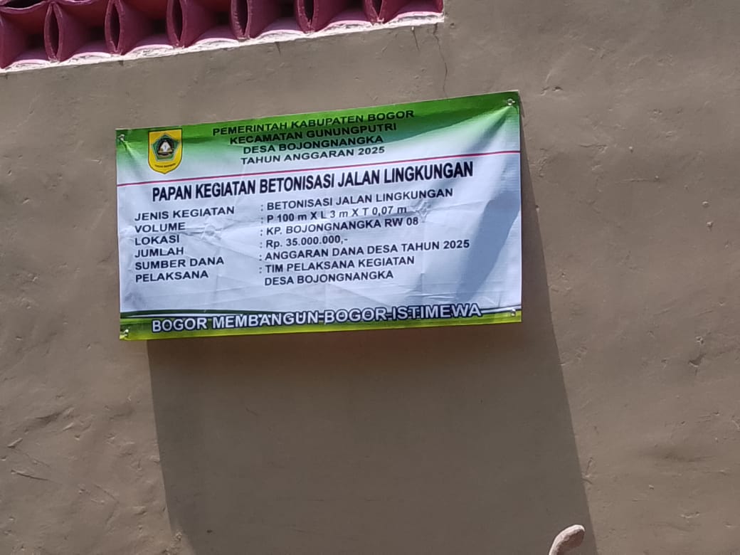 Pemerintah Desa Bojongnangka juga menyampaikan apresiasi kepada Pemerintah Kabupaten Bogor, khususnya Bapak Rudy Susmanto, atas dukungan dan penyaluran Dana Desa Tahun Anggaran 2025 yang memungkinkan pembangunan infrastruktur ini berjalan lancar dan tepat sasaran.