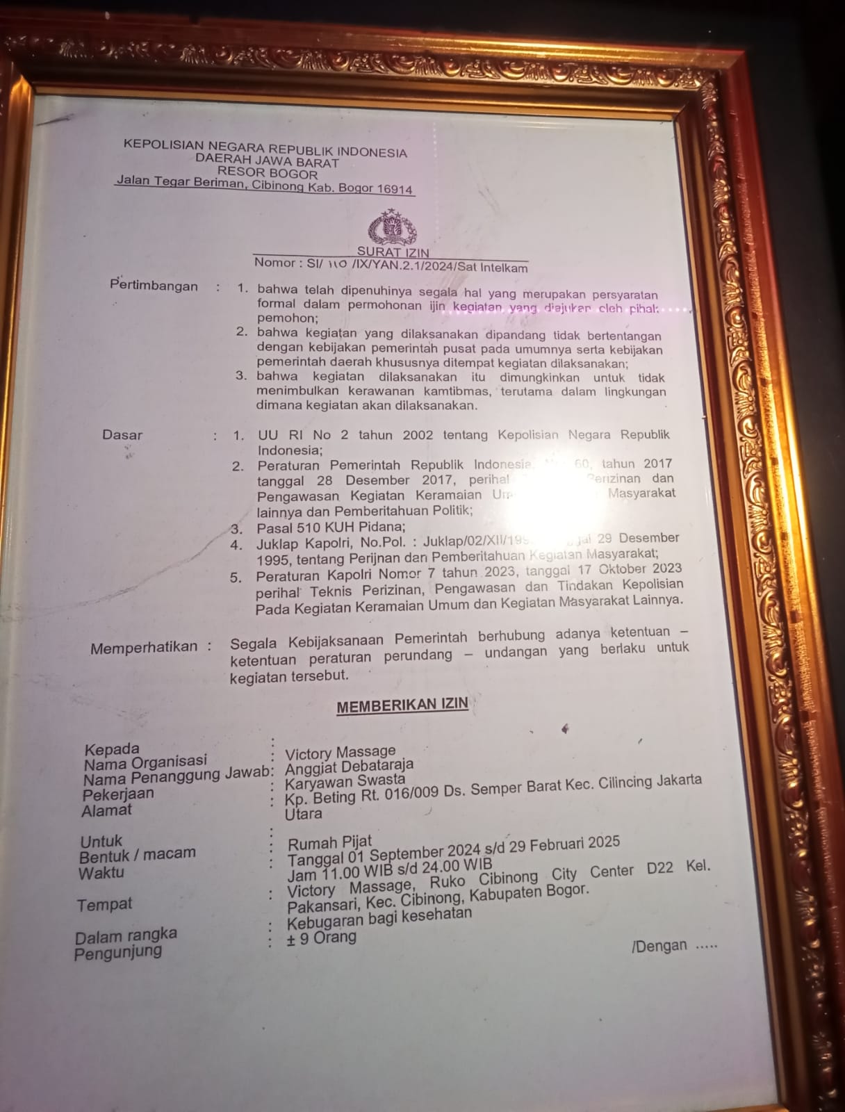 Bogor, Satunews.id – Kamis, 23 Oktober 2025 |Tim investigasi Persatuan Wartawan Pemda (PWP) menerima aduan masyarakat terkait keberadaan tempat pijat “Victory Massage & Men’s Healthy” yang berlokasi di Ruko Sebrang CCM Blok D No. 22, Kelurahan Pakansari, Kecamatan Cibinong, Kabupaten Bogor. Tempat tersebut diduga kuat menjadi kedok praktik prostitusi terselubung berkedok layanan pijat kebugaran, dan telah menimbulkan keresahan di kalangan warga sekitar.