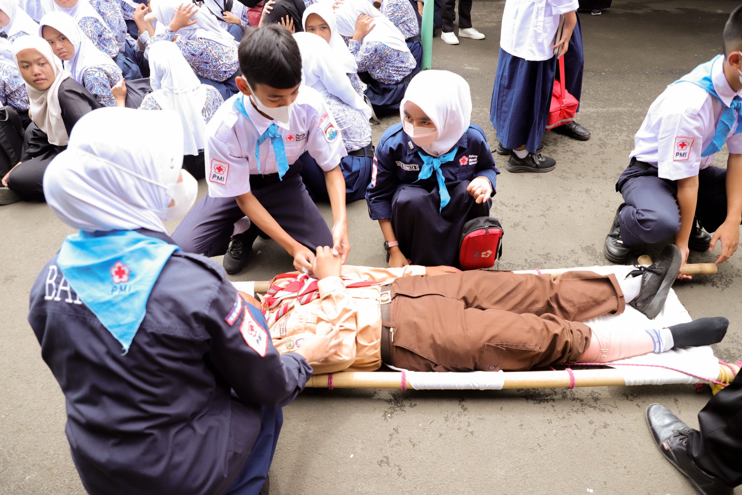 Dalam simulasi tersebut, siswa dan tenaga pendidik dilatih melakukan perlindungan diri, evakuasi menuju titik aman, hingga penanganan korban luka ringan dan berat.