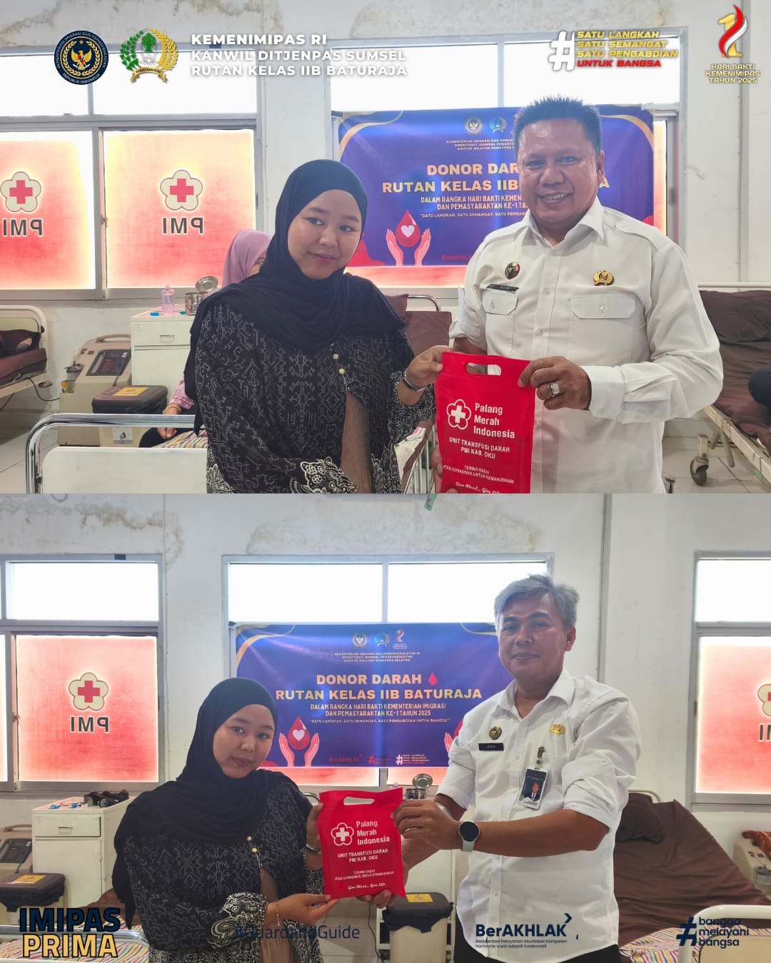 Oku, Satunews.id – Dalam rangka memperingati Hari Bakti ke-1 Kementerian Imigrasi dan Pemasyarakatan, Rutan Kelas IIB Baturaja menggelar kegiatan sosial berupa donor darah di Unit Transfusi Darah Cabang (UTDC) PMI Kabupaten Ogan Komering Ulu (OKU). Kamis, (13/11/2025)