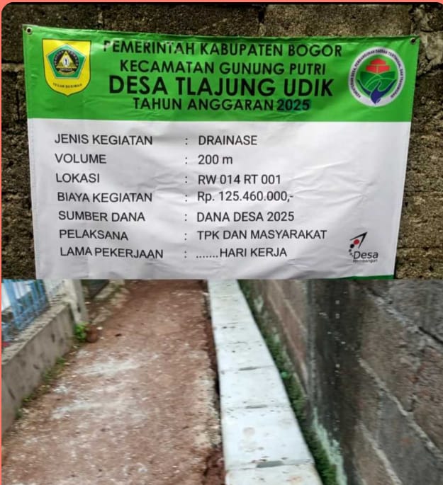 Bogor, Satunews.id – Selasa ,18 /11/2025–Pemerintah Desa Tlajung Udik telah melaksanakan realisasi pembangunan infrastruktur berupa drainase dengan volume 200 meter, berlokasi di RW 014, RT 001. Kegiatan pembangunan ini menggunakan anggaran sebesar Rp125.460.000, yang bersumber dari Dana Desa Tahun 2025.