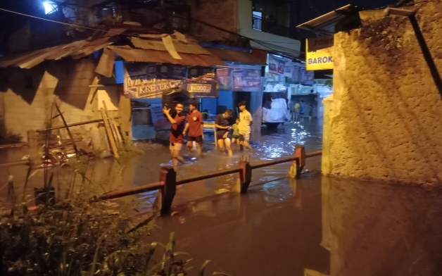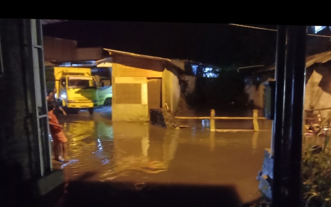 Kondisi ini terjadi akibat tingginya intensitas hujan yang datang secara tiba-tiba, sehingga saluran air tidak mampu menampung debit air dan menyebabkan luapan ke badan jalan serta area pemukiman. Beberapa rumah dan akses gang di sekitar lokasi juga ikut terdampak.