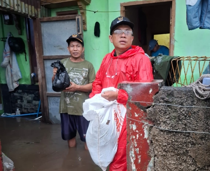 Dengan menggunakan jas hujan dan menerjang genangan air setinggi lutut, Kepala Desa mendatangi rumah-rumah warga untuk memastikan bantuan logistik diserahkan tepat sasaran. Bantuan berupa paket kebutuhan pokok itu diharapkan dapat meringankan beban masyarakat yang kesulitan beraktivitas akibat banjir.