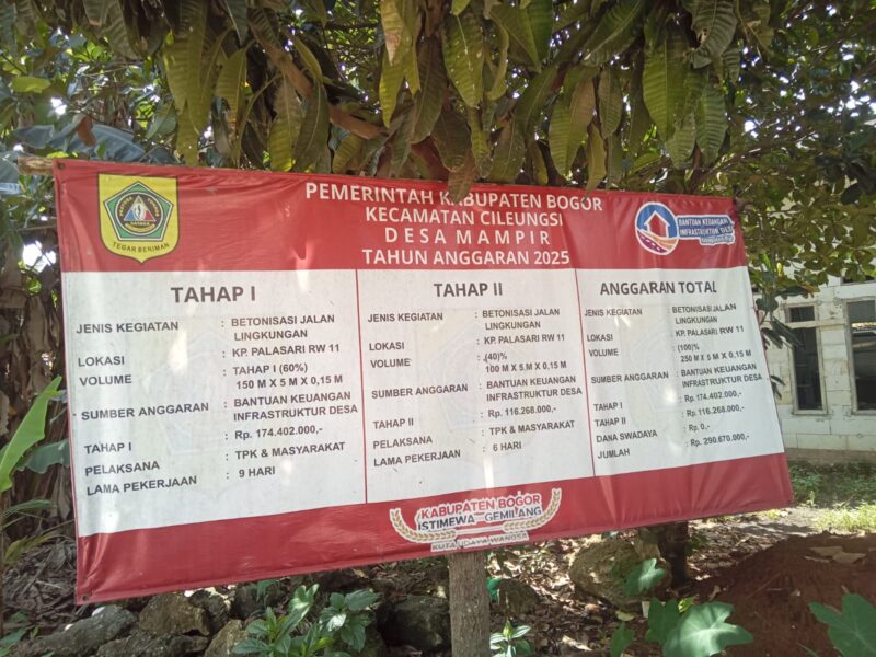 Satunews.id – Bogor, Senin,29 Desember 2025 | Pemerintah Desa (Pemdes) Mampir, Kecamatan Cileungsi, Kabupaten Bogor, pada Tahun Anggaran 2025 telah merealisasikan dan merampungkan pembangunan infrastruktur desa berupa betonisasi jalan lingkungan yang berlokasi di Kampung Palasari RW 11, melalui program Bantuan Keuangan Infrastruktur Desa (Bankeuifdes).