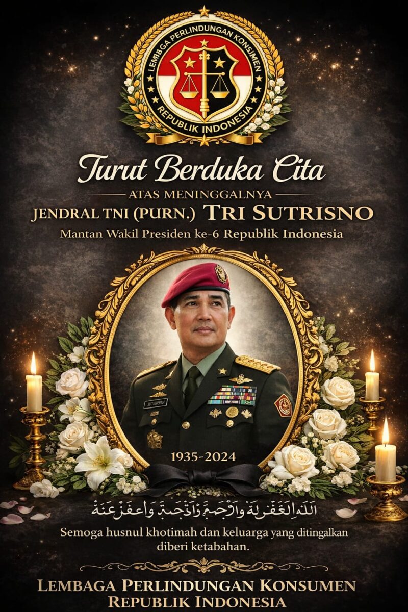 satunews.id – JAWA BARAT — Keluarga besar Lembaga Perlindungan Konsumen Republik Indonesia (LPK-RI) Dewan Pimpinan Daerah Provinsi Jawa Barat menyampaikan duka cita yang sedalam-dalamnya atas wafatnya Jenderal TNI (Purn.) Tri Sutrisno, Wakil Presiden Republik Indonesia ke-6, sosok negarawan, prajurit sejati, sekaligus putra terbaik bangsa.Senin (02/03/2026)