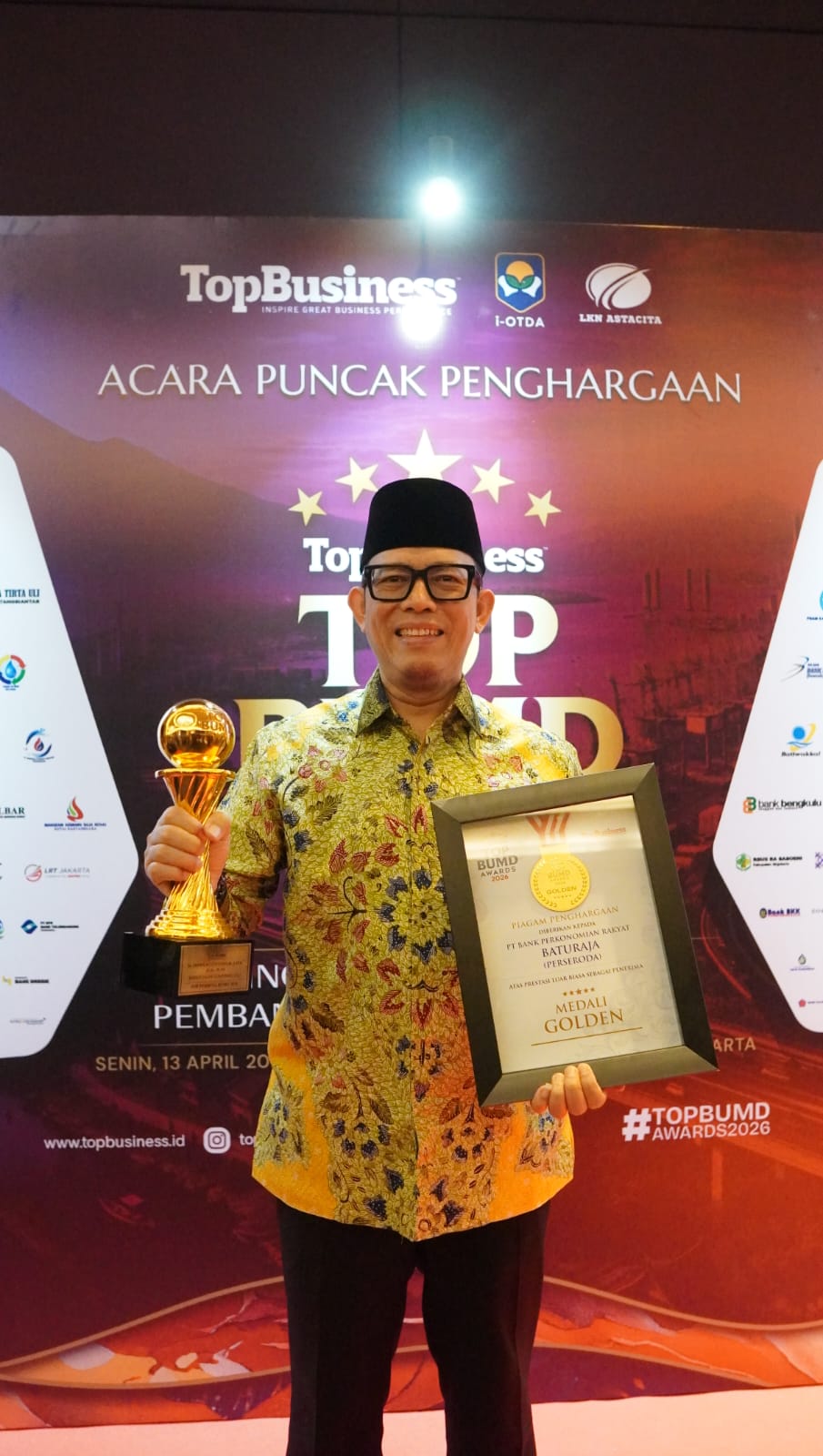 Kemudian penghargaan TOP BUMD Award 2026 Kategori bintang 5 diraih oleh PT BPR Baturaja serta penghargaan TOP CEO BUMD 2026 diraih oleh Direktur Kepatuhan BPR Baturaja Fitriyadi Suhendra.