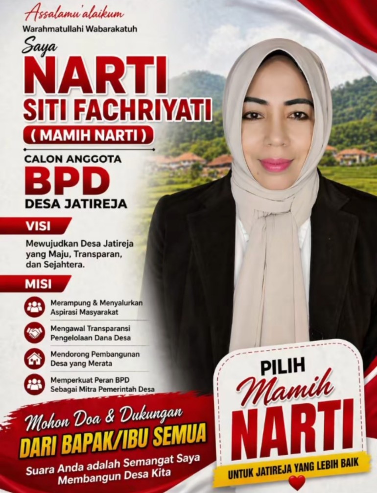 Kabupaten Bekasi, Menjelang proses pengisian Badan Permusyawaratan Desa (BPD), salah satu calon yang turut maju adalah Narti Siti Fachriyati, yang akrab disapa Mamih Narti. Ia menyatakan kesiapannya untuk mengabdikan diri demi kemajuan Desa Jatireja melalui peran strategis di BPD.