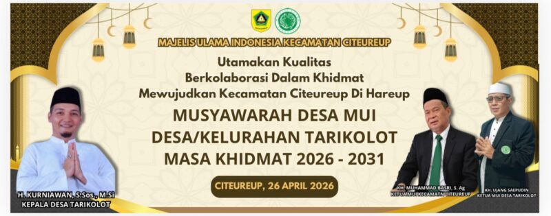 Satunews.id, Citeureup, Bogor – Semangat kebersamaan dan nilai-nilai khidmat mewarnai pelaksanaan Musyawarah Desa Majelis Ulama Indonesia (MUI) Desa Tarikolot masa bakti 2026–2031. Forum strategis ini bukan sekadar agenda rutin organisasi, melainkan momentum penting dalam memperkuat sinergi lintas sektoral demi mewujudkan Kecamatan Citeureup yang lebih maju, berdaya, dan bermartabat—Citeureup di hareup.Minggu (26/04/2026)